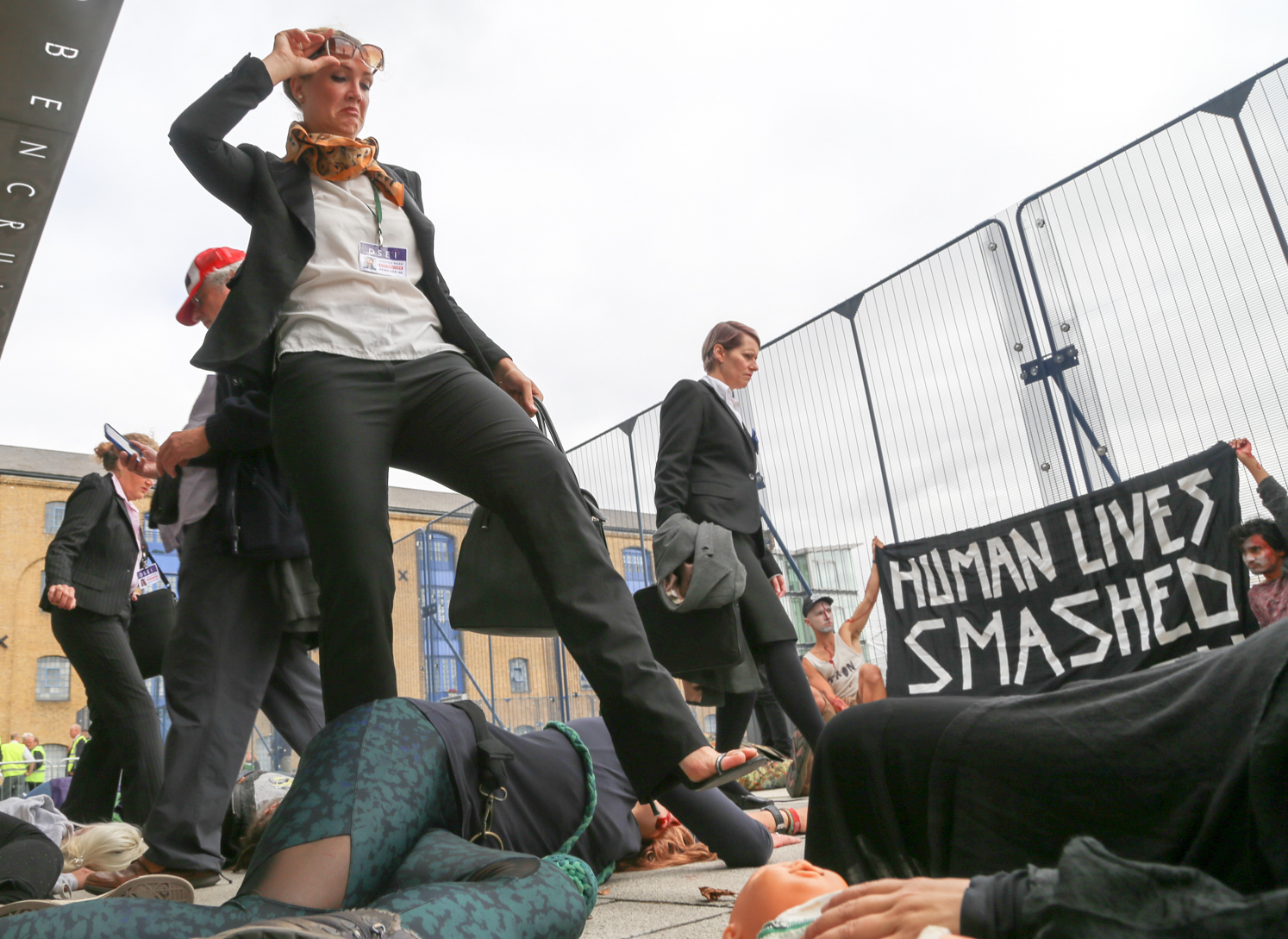 Attendees of the DSEI arms fair stepping over corpses.