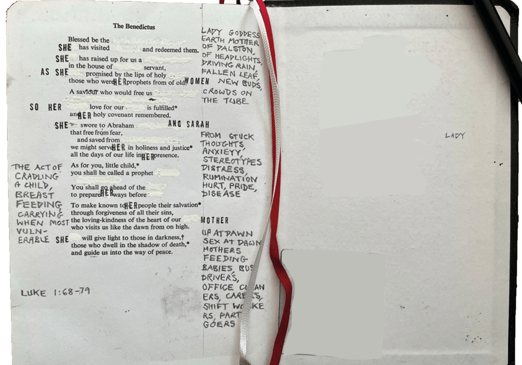 Reciting the Benedictus is something I do in my head. I change the words according to the seasons, places, the amount of time I have, and what mood I’m in. To present my version on paper, I have set it out as a page of a prayer book, with options, which seems fitting for a practical theology. The act of writing in to the prayer book for this page was contemplative itself.